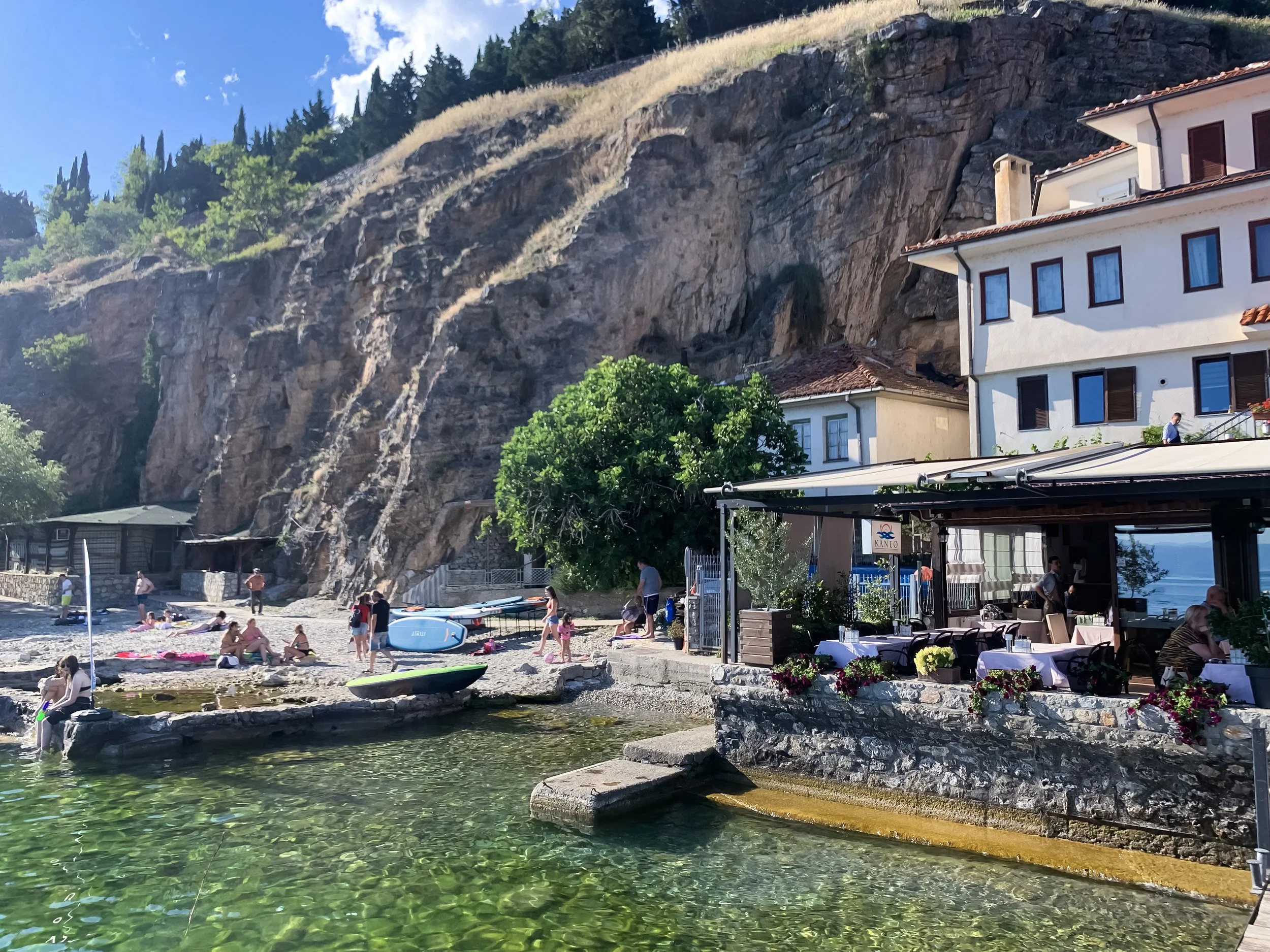 The other beach option is located in the town itself and is a bit of a fabulous life hack. So remember those overcrowded town beaches I mentioned? If you keep walking past them, eventually you’ll hit a restaurant called Kaneo. It’s the best place in town AND it happens to have a little beach of its own. Because it’s separated from the other ones by a few turns and twists of the coastline, the crowd doesn’t get to it, so it is almost like your own private beach. The time to go there is early afternoon, because it is shielded by a cliff from the setting sun, so you’ll lose the sunshine there a little earlier than in other locations but then what you do is migrate to the restaurant where you can sit on their pier with your glass of wine enjoying the last rays of sunshine. You’re welcome 😉.