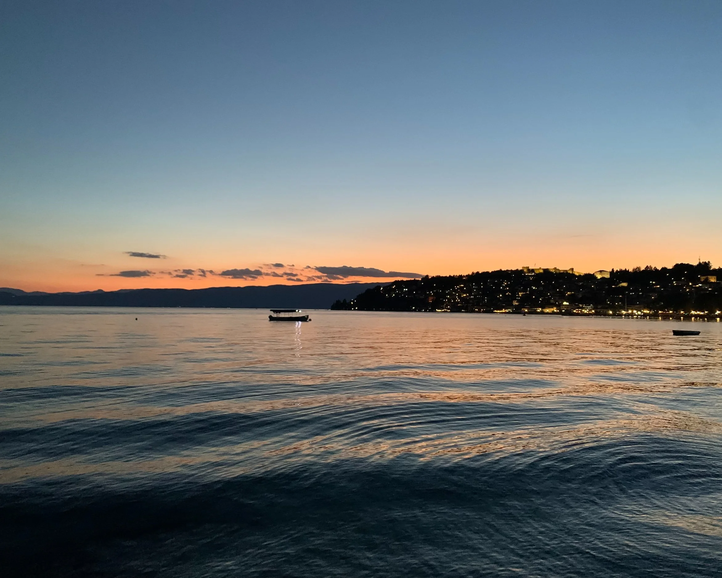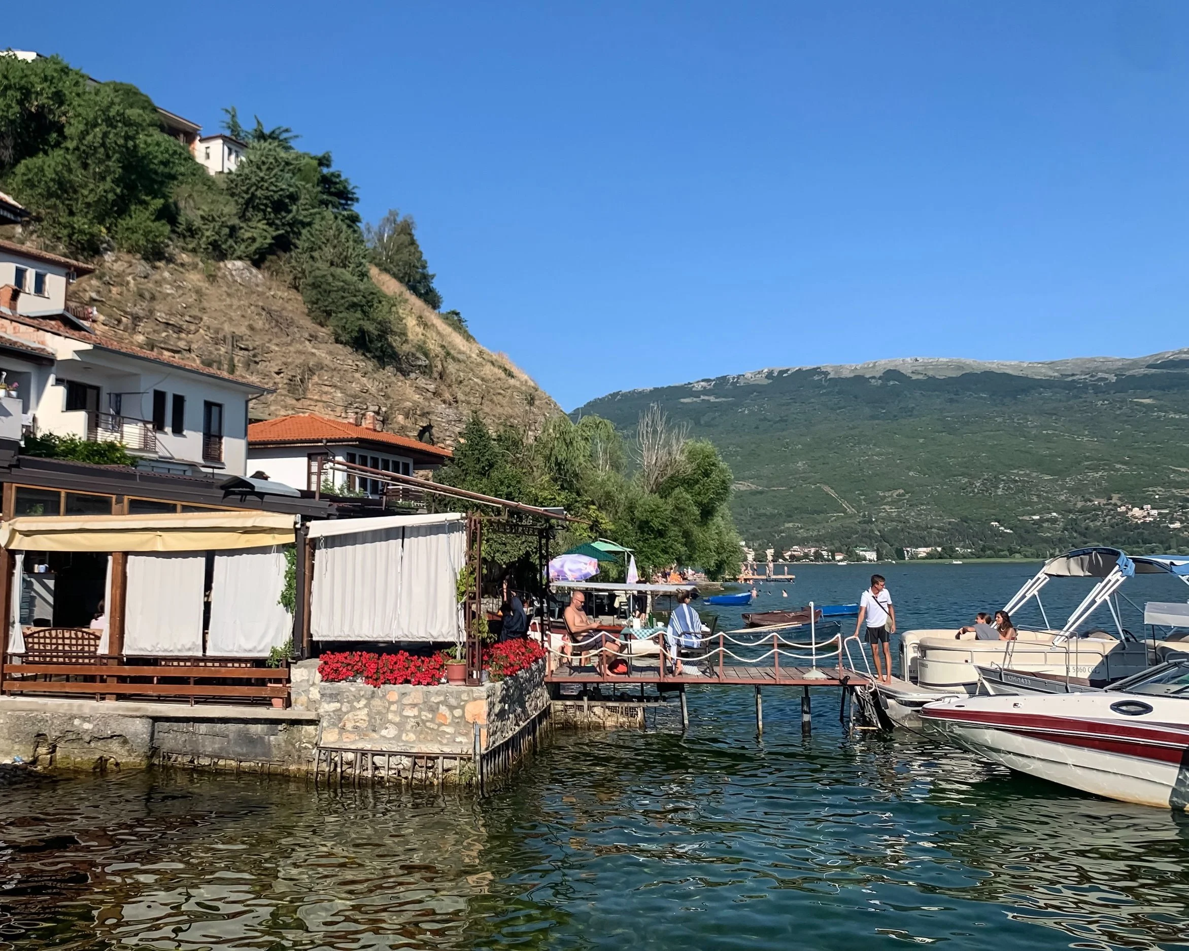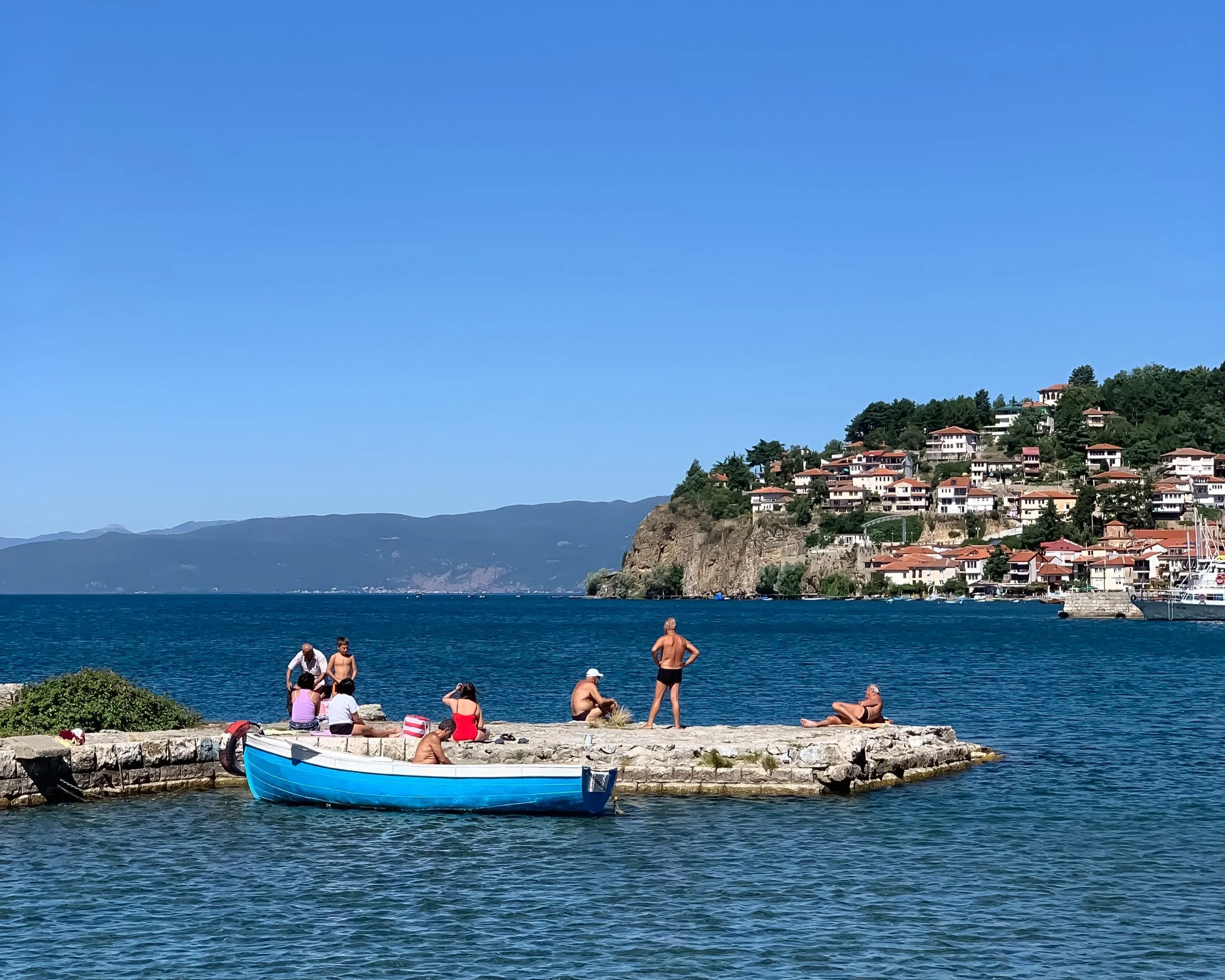 Glassy waters, classy pearls, friendly smiles, ancient history, sunset vibes… Not what comes to mind when you think of the Balkans. Yet, Lake Ohrid is exactly that. Its historical heritage rivaling Dubrovnik sans the cruise ships, the vibe is positively Lake Como — from the curvy coastline dotted with cypress trees to the beauties in flowy dresses arriving by boat at the beach restaurant to be seen at, to kids playing in the shallows with that effervescent quality of a carefree childhood, to men and women of undetermined age splitting the cool waters off the broken down pier by the port with their leathery bodies.