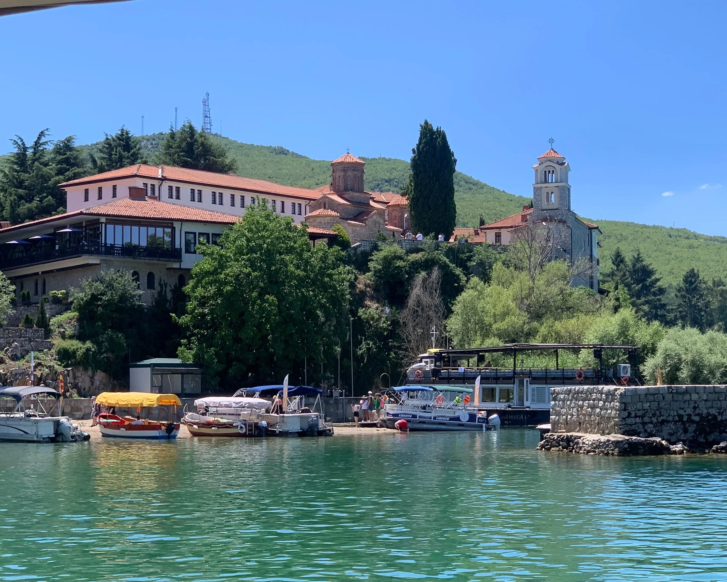 I highly recommend taking one of the river boat excursions foca full day’s experience sailing along the coast. The boat stops on a few historical places such as ancient churches and an archeological site with an ancient settlement, which was very cool, finishing at the Port of St. Naum — a monastery and a beach place at the Albanian border.